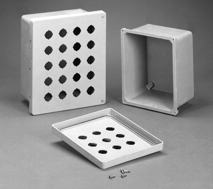 - Molded fiberglass polyester enclosure with matching cover is easily punched, cut, or drilled.