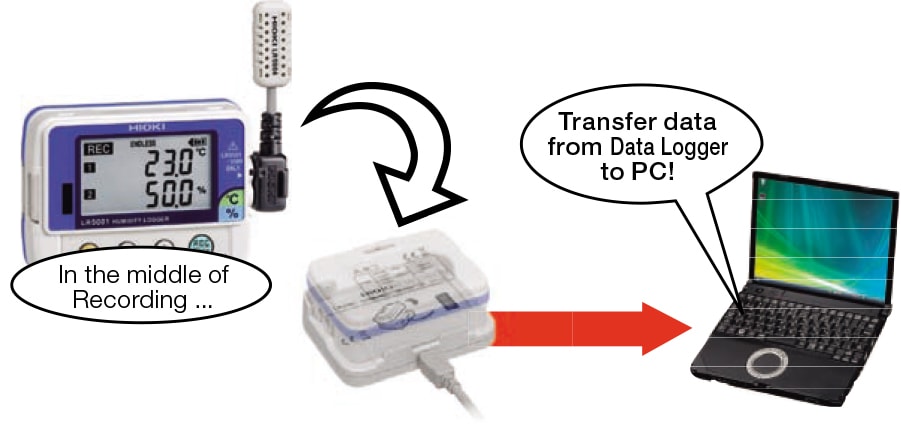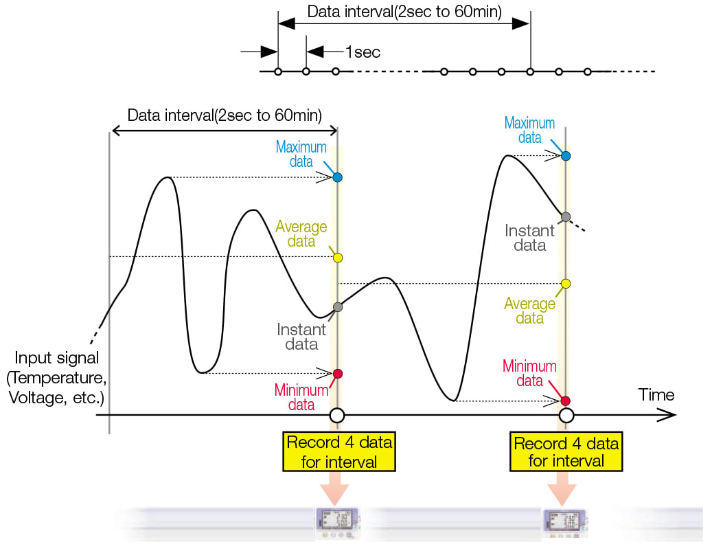 Temperature and humidity are recorded simultaneously using supplied or optional temperature and humidity sensors. |