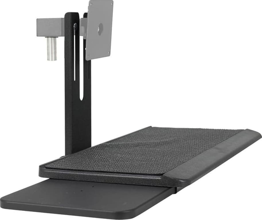 The IAC Industries QS-1022918 is a flat panel display keyboard and mouse holder that can be mounted to all versions of IAC's Flat Panel Display swing arms, except for those sold before 7-1-05. The keyboard tray includes a non-skid mat and extendable mouse holder that can be positioned to the right or left side of the keyboard tray. The keyboard tray holds keyboards up to 8" deep and 21" long. It also adjusts vertically to accommodate flat panel displays measuring 12" thru 21" overall height.
