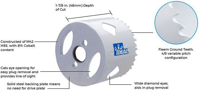 When it comes to purchasing a Bi-Metal Hole Saw, look no further. The IDEAL® Bi-Metal Hole Saw utilizes M42 high-speed steel with 8% premium cobalt and a rigged solid back plate. Providing 2.3x more holes than leading manufactures with the highest strength and greater wear resistance. The extreme deep gulleted teeth design clears out uniform chips that minimize binding on the job that provides 1.2x faster drilling time than the leading manufacturers in the market. With a standard 1-7/8" cutting dept, you can save time cutting 2’x4’s with a single pass design. The IDEAL® Bi-Metal Hole Saws effectively cut through a wide range of materials, including stainless steel, sheet metal, as well as common non-fer - rous materials, such as aluminum, copper, brass, wood, engineered wood, nail embedded wood and plastics. When it comes to IDEAL vs. the competition, we have the professional in mind. The wide offering includes sizes from 7/8" to 6" that include diamond side eyes to provide ease of slug removal. The 2" to 6" Bi-Metal Hole Saws have large cat eyes on the back, that not only provide line of sight but aid in plug removal. IDEAL is the professional’s choice for Bi-Metal Hole Saws.