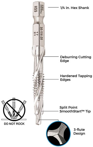 The IDEAL® line of combination drill taps combines the tasks of drilling, tapping and deburring all into one. Providing an economical way to save you valuable time on the project. Constructed out of High Speed Steel (HSS) providing strength and durability, the bit has balanced hardened tapping edges with 1/4" hex shank that makes it compatible not only with cordless drills but also impact drivers. Similar to the IDEAL® TKO™ Carbide Tipped Hole Cutters we have incorporated the SmoothStart™ tip which minimizes thread damage and extends the life of the bits. While traditional drill taps have single or double flute design, IDEAL® Drill taps come with 3-flute design providing faster chip removal and minimizes binding while drilling. The deburring cutting edge provides a clean hole and prevents over drilling. Rated for drilling and tapping up to 10 gauge mild steel, aluminum, copper, brass and even plastic. When it comes to quality, performance and durability, IDEAL® is the professional’s choice for drill tap needs.