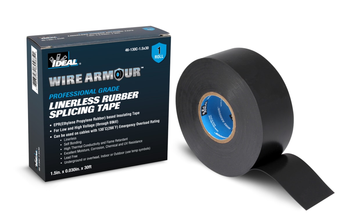 The Ideal 46-130C-X is linerless rubber splicing tape that is available in 3/4-, 1-, 1.5- or 2-inches width by 30 feet length. It is an ethylene rubber based, high voltage tape ideal for insulating and jacketing of splices on power cable from 600 to 69K volts and for building stress cones and jacketing of terminations on power cable from 600 to 35K volts. The 46-130C series allows quicker taping speeds than liner tape and provides a uniform, void-free build-up while conforming to complex shapes.