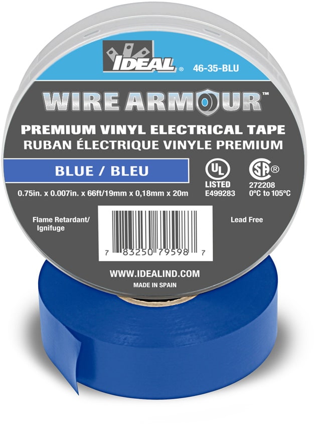 The IDEAL line of premium vinyl electrical tape provides superior performance over a wide range of temperatures up to 105°C. Suitable for wide temperature extremes, from cold weather applications as low as -18°C. With blue core technology that provides high elasticity, that is flame retardant, high UV resistance that is impervious to water, oil, acids, alkalis, and a wide variety of corrosive chemicals. Primary for insulation for splices up to 600V. Brought to you by IDEAL Electrical, your manufacturer of choice.