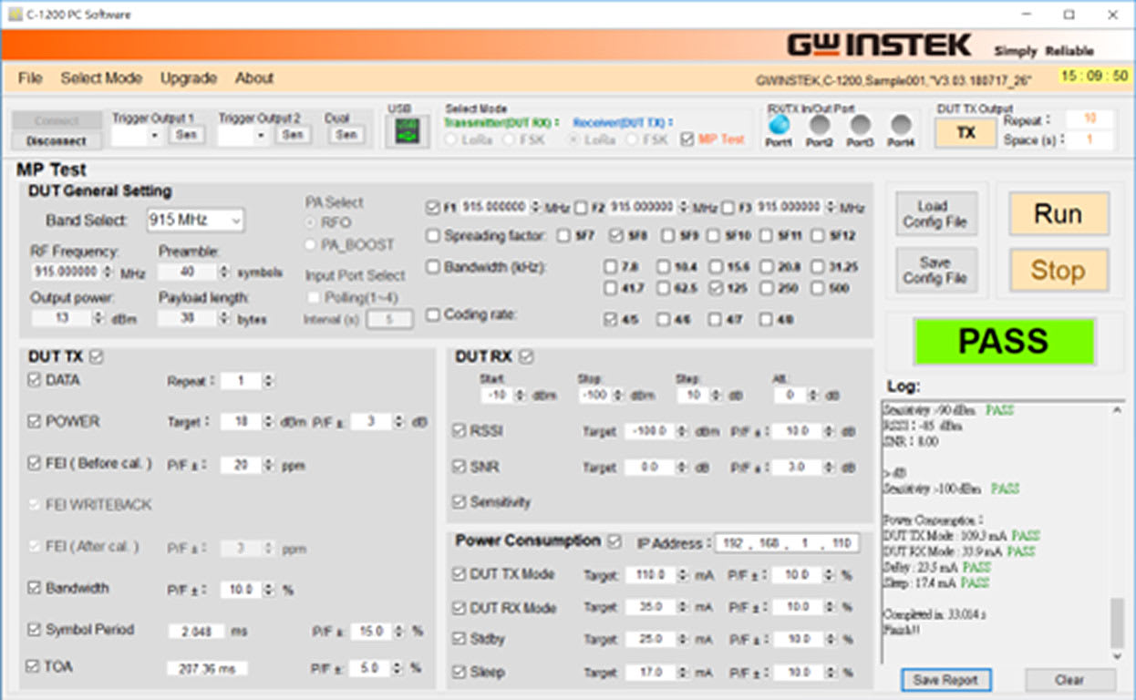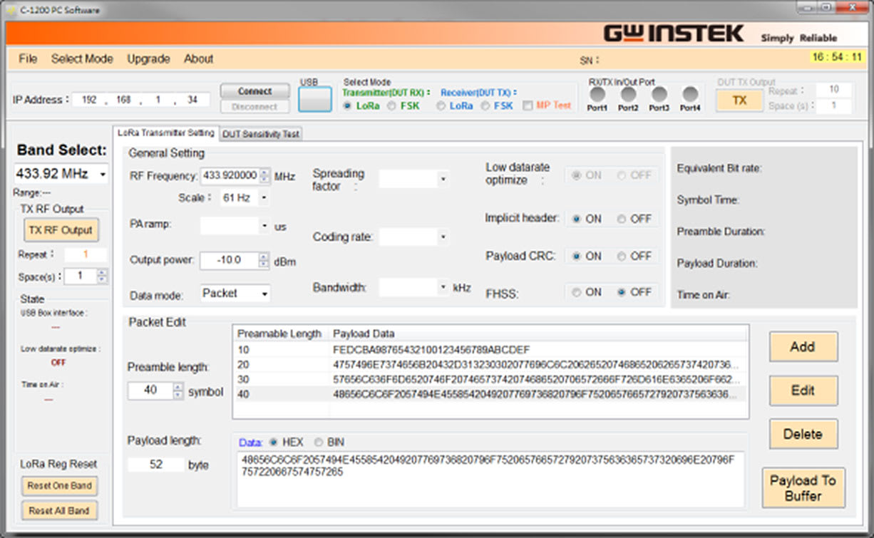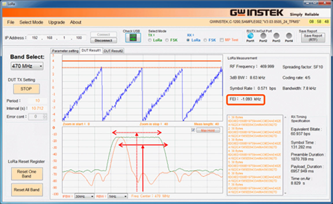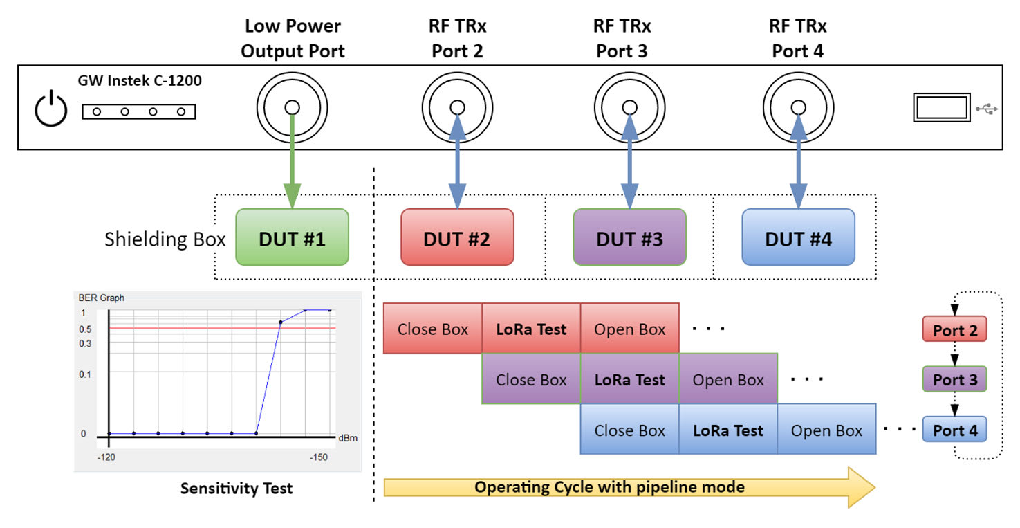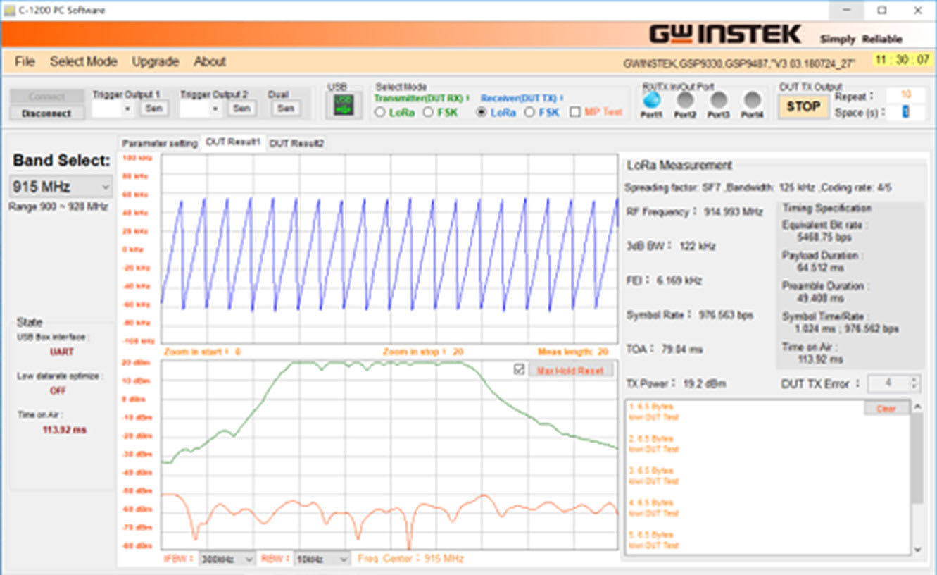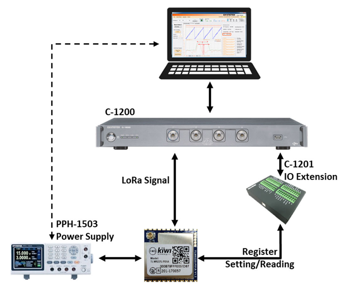 C-1200 is an One Box Tester that incorporates LoRa TX and RX tests. It provides spectrum analysis, time domain, FEI (Frequency Error Indicator), and TOA (Time On Air) for transmitter tests, and sensitivity, BER (Bit Error Rate), and PER (Packet Error Rate) for receiver tests. In addition to Sub-GHz, C-1200 also supports the 2.4 GHz bandwidth and the FSK signal test. Users can also edit the transmitted payload by themselves. When receiving data, the formats include binary, HEX, and ASCII code, which allow data transmission results to be easily confirmed. In addition to the signaling test of the finished product, C-1201 is a transfer box connecting C-1200 to LoRa module that directly controls the DUT to perform non-signaling tests on semi-finished products through UART/SPI/I2C interfaces.