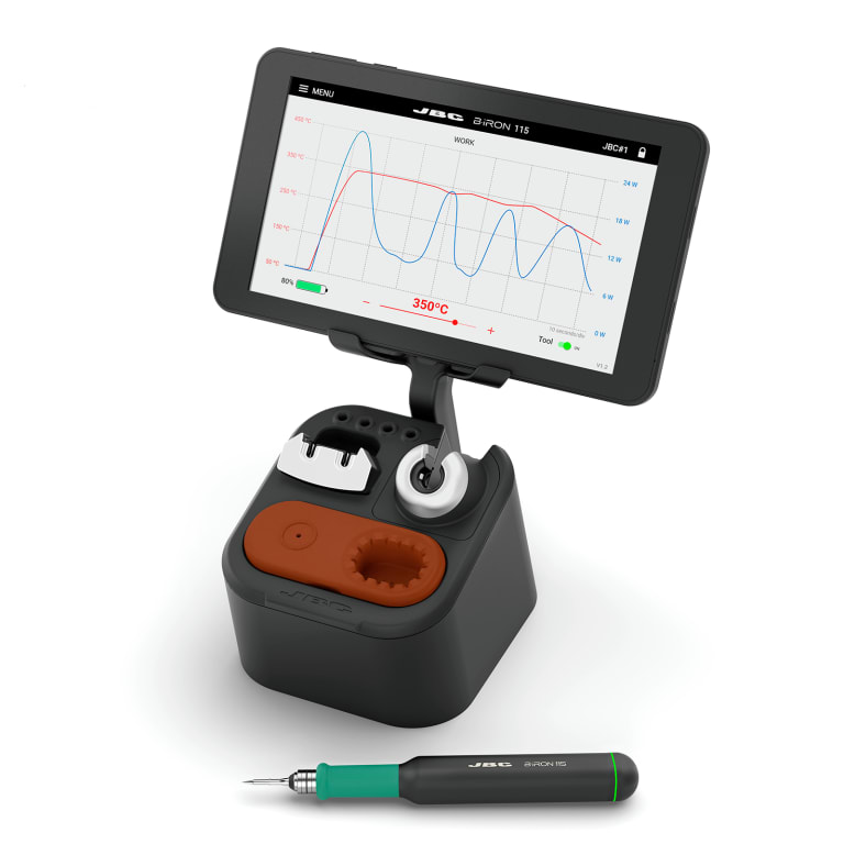 The JBC B-IRON 115 is a rechargeable, battery-powered soldering station with a B115 Nano high precision handle, 7” touch-sensitive screen, and more. This system is compatible with C115 tips, which can be viewed by clicking here.