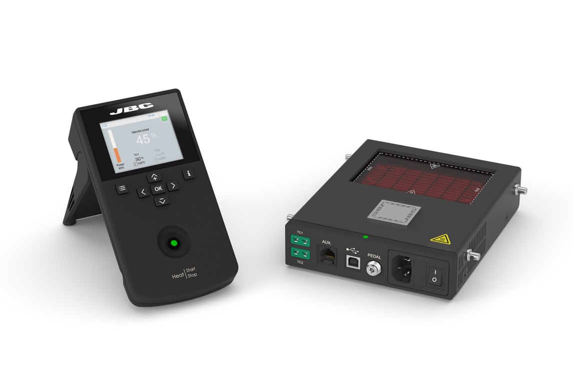 The JBC PHNE-1A Nano preheater set is the best solution for rework on small circuits, featuring a heating area of 4.25 x 2.75 inches. It reduces the risk of thermal shock while reworking and offers matches reliability in temperature accuracy so that no component is damaged.