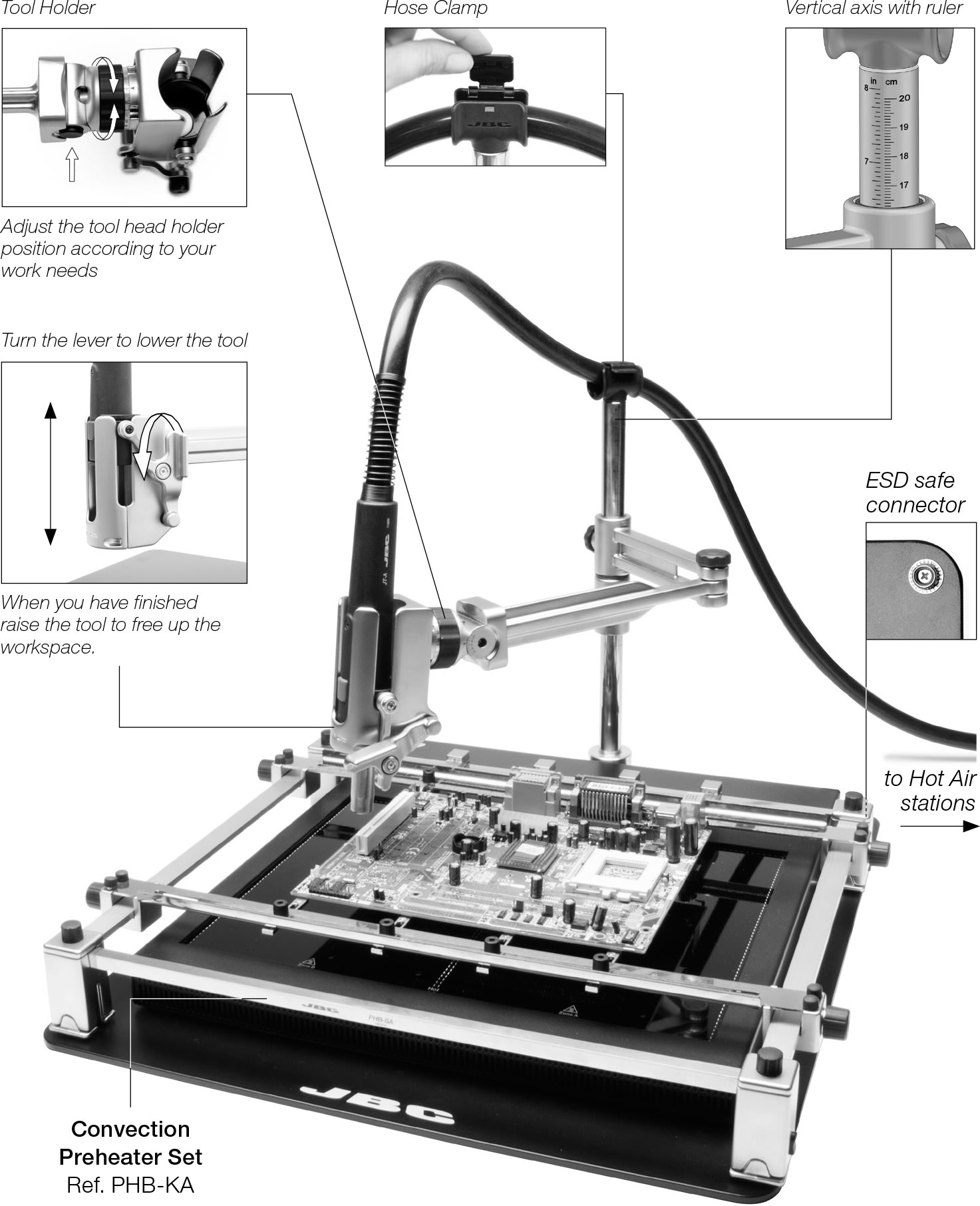 The RWB-B is ideal for working with JBC’s hot air stations and a preheater, especially the PHBE-K. Please note, the image below is for illustrative purposes and shows optional items. Hot air stations and pre-heaters are sold separately.
