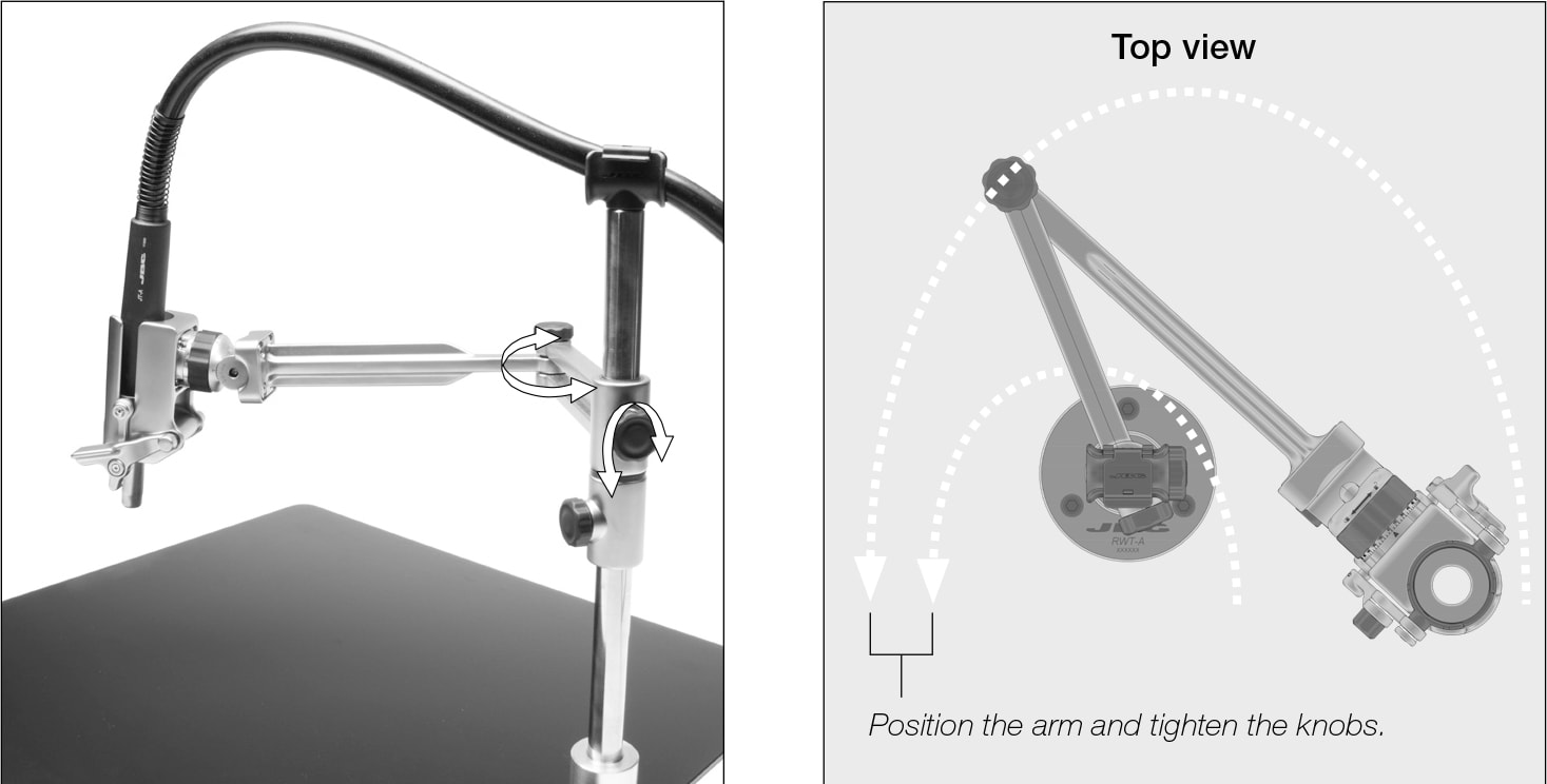The RWT-B arm allows adjustment for different positions according to your work needs. The articulated arm covers all work areas.
