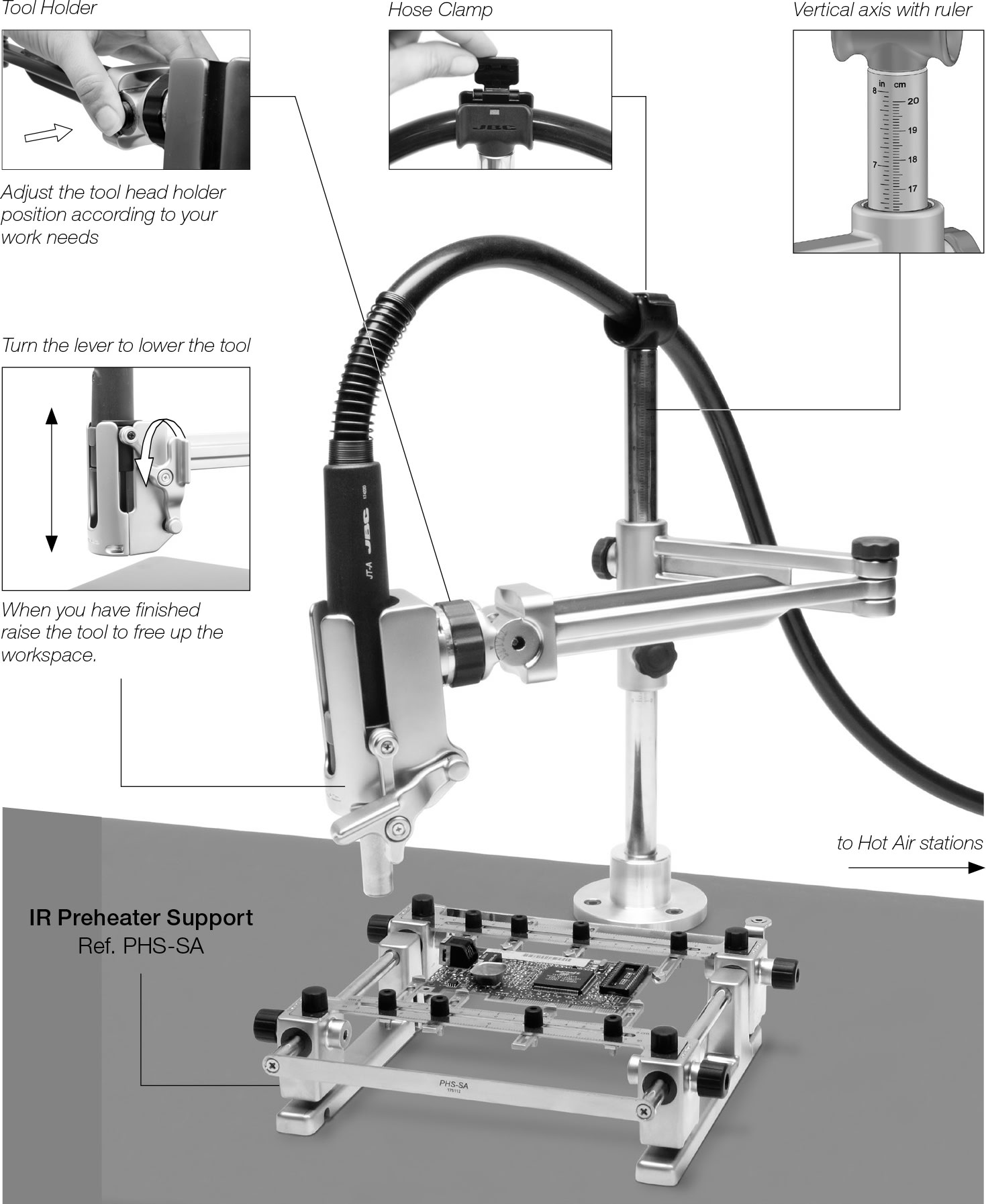 The JBC RWT-B is an adjustable rework arm which supports heater hose sets and enables hands free operation. This model does not have a base and screws directly into the workbench. The RWT-B includes adapters making it compatible with both the JTSE and TESE hot air stations. The tool holder allows inclination and rotation adjustment, and both the vertical axis and tool holder have scaled articulation for easily repeated tasks. The hose clamp holds the heater hose away from the work area to keep it clear of obstacles.