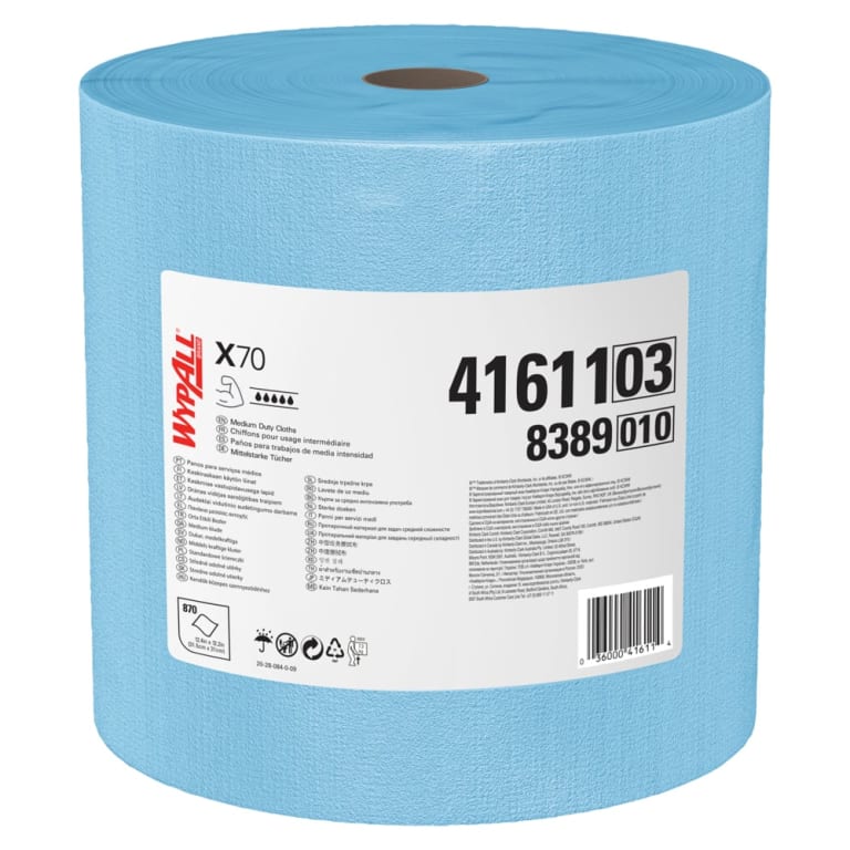WypAll is the number one brand of disposable wipes in the US and Canada. Maximize performance while minimizing time, effort, and product waste. If you’ve been using either laundered shop towels or textile shop rags, you can trust WypAll® Power Clean X70 Medium Duty Cloths. They are heavy-duty cloths, with high-tech HydroKnit fast-absorbing material. WypAll® Power Clean X70 Medium Duty Cloths premium industrial cloths are made of soft pulp fibers, bonded to a polypropylene base sheet for absorbency and tear resistance, making them suitable for removing dirt, oil, grime, and solvents in a variety of industrial and manufacturing industries. Plus, they come in a convenient Jumbo Roll (fits on a compatible Jumbo Roll dispenser as an alternative to a box of rags) and are so sturdy that they can often be used more than once (once you’ve used them a few times, they’re disposable). They are designed to clean surfaces and tools, making them a must-have for the HVAC, automotive, manufacturing, and industrial industries. When you’re running a business, it pays to use the very best supplies and WypAll® fits the bill.