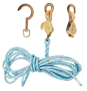 Light, galvanized-steel shell blocks are fitted with snubbing hooks to hold the load. Sheaves are strong yet lightweight aluminum alloy with all-bronze bushings. Swivel hook Cat. No. 259. Hooks fit under insulator and engage pin on cross arm. 3/8-Inch (10 mm) diameter rope.