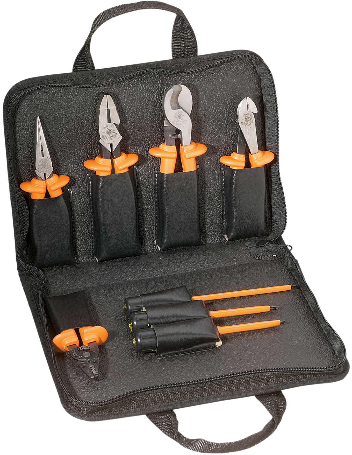 This 8 piece set features an assortment of popular insulated tools. Each are individually tested to exceed the IEC 60900 and ASTM F1505 standards for insulated tools. The highly durable, black nylon case features a zipper closure, custom-fitted tool pockets plus an extra pocket for storage of papers and other items. Made in the USA.