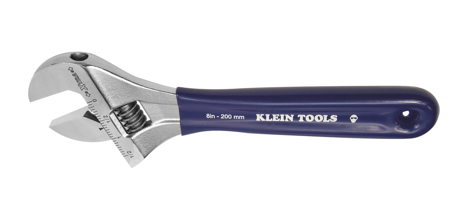 The Klein Tools D509-8 Extra-Wide Jaw Adjustable Wrench is designed to give you greater capacity in tight work spaces. This 8'' wrench features a 1-1/2-Inch jaw capacity, which is typically found on 12-Inch adjustable wrenches. The design also features a minimally protruding jaw shank that allows the jaw to open wider in confined work areas.