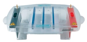 ENDURO™ Horizontal Gel Boxes have been designed for ease of use, safety and durability. A variety of sizes are available, from a mini gel system to a large maxi gel system that can accommodate as many as 450 samples in a single run. A wide range of accessories are available to customize your system, including multichannel compatible gel combs. QUALITY CONSTRUCTION The ENDURO™ gel tanks are molded for leak-proof performance and a long service life. The corrosion resistant platinum electrodes are located in cassettes to protect them during cleaning and provide for easy replacement. The lids fit on the gel boxes in only one direction. A drip ring on the lid recycles condensed buffer and prevents it from dripping directly onto the gel. EASE OF USE Casting gels for the ENDURO™ system is very easy. Simply snap the rubber gates onto the ends if the tray, place the comb in position and pour the gel - no taping is necessary. Slots on the sides of the gel trays hold the combs in place. The two piece combs are designed so that the teeth can be raised or lowered to vary the depth of the well within the gel. The supplied combs are 1.5 mm thick. Combs of other thicknesses are available separately. After the gel has hardened, the combs and gates are removed and the gel and tray placed in the gel box. Loading strips may be placed on the bottom of the gel box to aid in well visualization. Gel trays are UV transparent. DESIGNED FOR SAFETY The power leads for the ENDURO™ system are attached to the gel box lid. The connection with the electrodes is made only when the lid is properly in place. Removal of the lid removes power from the system. Side tabs and pressure pads make lid removal easy and prevent sloshing of buffer.