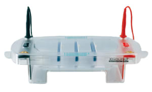 Mini Gel System ENDURO™ Horizontal Gel Boxes have been designed for ease of use, safety and durability. A variety of sizes are available, from a mini gel system to a large maxi gel system that can accommodate as many as 450 samples in a single run. A wide range of accessories are available to customize your system, including multichannel compatible gel combs. Quality Construction The ENDURO™ gel tanks are molded for leak-proof performance and a long service life. The corrosion resistant platinum electrodes are located in cassettes to protect them during cleaning and provide for easy replacement. The lids fit on the gel boxes in only one direction. A drip ring on the lid recycles condensed buffer and prevents it from dripping directly onto the gel. Ease of Use Casting gels for the ENDURO™ system is very easy. Simply snap the rubber gates onto the ends if the tray, place the comb in position and pour the gel - no taping is necessary. Slots on the sides of the gel trays hold the combs in place. The two piece combs are designed so that the teeth can be raised or lowered to vary the depth of the well within the gel. The supplied combs are 1.5 mm thick. Combs of other thicknesses are available separately. After the gel has hardened, the combs and gates are removed and the gel and tray placed in the gel box. Loading strips may be placed on the bottom of the gel box to aid in well visualization. Gel trays are UV transparent. Designed for Safety The power leads for the ENDURO™ system are attached to the gel box lid. The connection with the electrodes is made only when the lid is properly in place. Removal of the lid removes power from the system. Side tabs and pressure pads make lid removal easy and prevent sloshing of buffer.