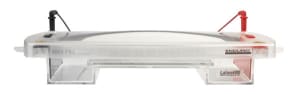 Designed for Ease of Use ENDURO™ Horizontal Gel Boxes have been designed for ease of use, safety and durability. A variety of sizes are available, from a mini gel electrophoresis system to a large maxi gel electrophoresis system that can accommodate as many as 450 samples in a single run. A wide range of accessories are available to customize your system, including multichannel compatible gel combs. QUALITY CONSTRUCTION The ENDURO™ gel tanks are molded for leak-proof performance and a long service life. The corrosion resistant platinum electrodes are located in cassettes to protect them during cleaning and provide for easy replacement. The lids fit on the gel boxes in only one direction. A drip ring on the lid recycles condensed buffer and prevents it from dripping directly onto the gel. EASE OF USE Casting gels for the ENDURO™ Horizontal Gel Electrophoresis system is very easy. Simply snap the rubber gates onto the ends if the tray, place the comb in position and pour the gel - no taping is necessary. Slots on the sides of the gel trays hold the combs in place. The two piece combs are designed so that the teeth can be raised or lowered to vary the depth of the well within the gel. The supplied combs are 1.5 mm thick. Combs of other thicknesses are available separately. After the gel has hardened, the combs and gates are removed and the gel and tray placed in the gel box. Loading strips may be placed on the bottom of the gel box to aid in well visualization. Gel trays are UV transparent. DESIGNED FOR SAFETY The power leads for the ENDURO™ system are attached to the gel box lid. The connection with the electrodes is made only when the lid is properly in place. Removal of the lid removes power from the system. Side tabs and pressure pads make lid removal easy and prevent sloshing of buffer.