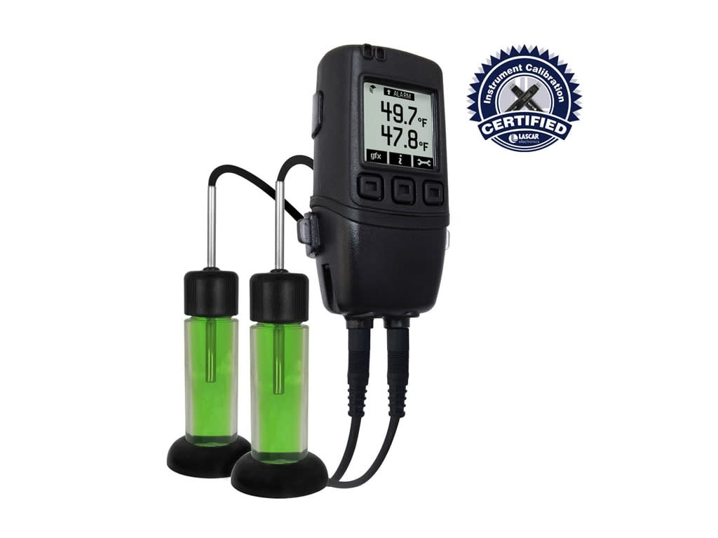 The EL-GFX-VAC2 is a vaccine monitoring kit combining a USB dual channel data logger with two glycol bottle probes. The unit stores over 250,000 readings, has an on-screen display showing max, min and last log as well as an on-board graph of the data collected. Buttons allow the user to start, stop and restart the logger in the field and alarm breaches can be registered with both LED and audible alarms. The logger can be battery powered or used with a USB wall adapter. Two channels allow measurement of two areas of a refrigerator or a refrigerator and freezer at the same time.