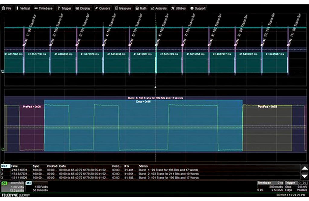 The Configurable Manchester and NRZ Decode options enable flexible, user-definable protocol decoding of serial buses built with these encoding schemes from 10 b/s to 10 Gb/s. The physical layer specs like bit rate, idle state and polarity can be easily defined enabling quick decoding of every bit transmitted on the bus. Higher level decode can be done by configuring bits to words and then words to packets.