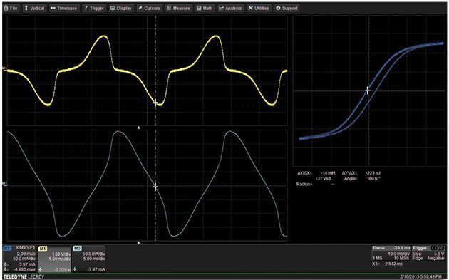 B-H Hysteresis Curve View the behavior of a magnetic device while it operates in circuit. Dynamic circuit changes show resulting magnetic saturation and operating region. Teledyne LeCroy’s HDO4000 and HDO6000 High Definition Oscilloscopes with 12-bit HD4096 technology are the ideal oscilloscope for power measurement. With 16x more resolution than a traditional 8-bit oscilloscope signal details of the saturation voltage are now clearly visible and conduction losses are more accurate.