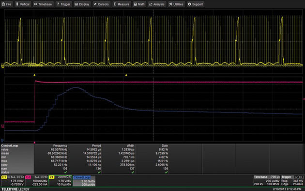 Control Loop Analysis View time domain display which graphically presents the modulated parameter in a time vs. parameter value graphical plot. A controller’s output pulse widths, duty cycles or frequencies, are individually plotted and time correlated with the controller’s output. Integrated with the oscilloscope’s triggering capabilities, this analysis is a convenient tool for intuitively viewing the time domain, closed-loop response of the entire control loop, including any time constants added by the pulse width modulator.