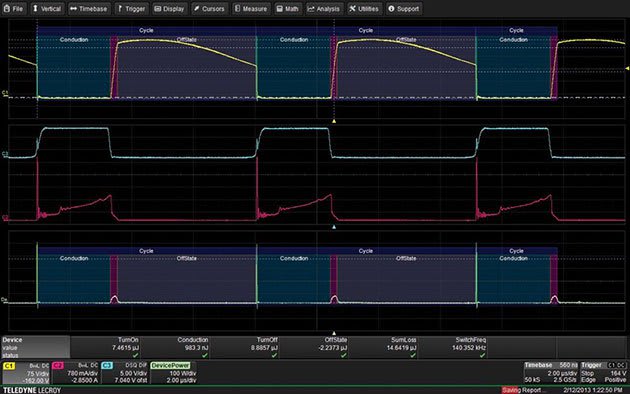 Analyze power device performance while the device is operating in circuit. Easily make switching loss, dynamic-on resistance, dv/dt and di/dt measurements. Quickly view safe operating area and B-H hysteresis curves. Power Device Losses Turn-on, turn-off and conduction zones are identified with a color coded overlay, power losses in these zones are automatically measured and displayed. Losses associated with the switching, conduction, and off-state are measured independently and displayed along with the sum of selected loss types. Safe Operating Area Gain insight to circuit performance by seeing SOA plots to look for violations in the first cycles after an event or over long time periods. Finding SOA violations that occur for only a few cycles after an event, such as short circuit or startup, can be problematic. These violations often go undetected, and degrade the device over time. Using the long record length and fast processing of Power Analyzer, SOA display on very long records, confirm turn-off voltage and current limits are not exceeded.