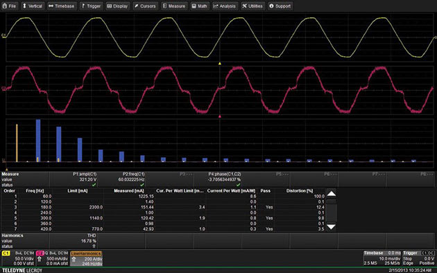 Line Power Analysis Easily measure an off-line power supply’s incoming RMS line voltage, RMS current consumption (in watts and VA), Power Factor, Apparent Power, Real Power and Crest Factor. Line current harmonic measurements are made and compared to standard templates for EN 61000-3-2 Class A, B, C, or D equipment. Results can be displayed graphically to see mask violations or in a table with test results. Total harmonic distortion measurements are provided with details of which frequencies are contributing to the distortion.