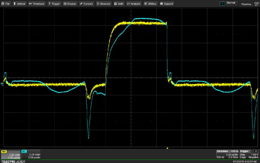 | The HVFO (yellow trace) and a conventional HV differential probe (blue trace) capture an upper-side gate drive signal. The HVFO exhibits a classic, textbook shape while the HV differential probe has more loading and lower-side device high dV/dt signal interference. |