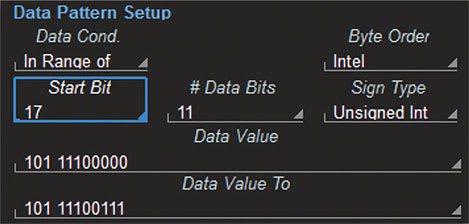 Specify one Frame ID or a range of Frame IDs. Frame ID trigger can be combined with Data. |