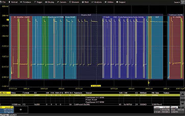Color Coding for FRAME, ID, DLC, DATA, CRC, Ack, Stuff Bits and Errors. Decode information is intelligently annotated based on timebase setting. |