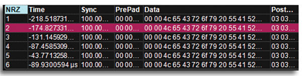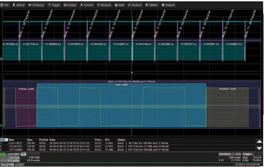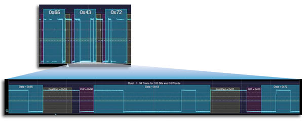 Color Coding for Idle, timeout, Prepad, Data, PostPad. Decode information is intelligently annotated based on timebase setting. |