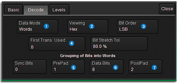 First Transition Used (0 - 400), Bit Stretch Tolerance (0 - 100 %), Sync Bits (0-1000), PrePad Bits (0 - 32), Data Bits (1 - 32), PostPad Bits (0 - 32) |