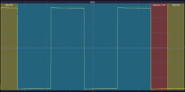 Color Coding for START Bit, STOP Bit, PARITY Bit, and DATA bytes. Decode information is intelligently annotated based on timebase setting, and overlaid on acquired waveform. |