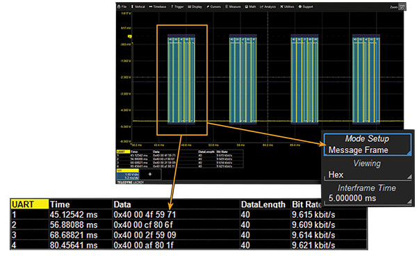 Threshold definition required. Default is to Percent amplitude. Select BitRate, # Data Bits (5 to 16), Parity (NONE, ODD, EVEN), # Stop Bits (1 or 2), Bit Order (MSB or LSB), and Polarity (IDLE HIGH or IDLE LOW) (for RS-232, no Bit Order or Polarity setup). Frame definition permits definition of UART byte packets into a single long (decoded) message package through a user-defined "Interframe Time" value. |