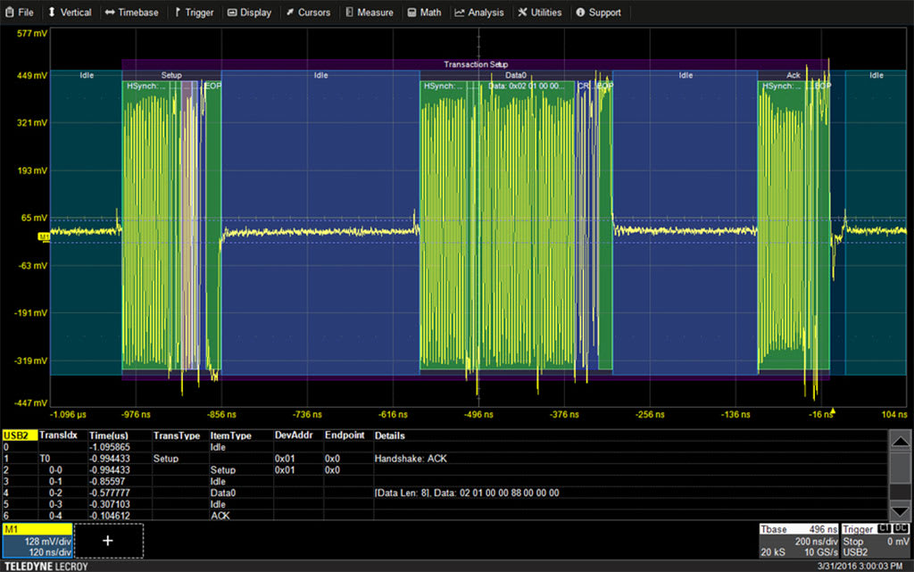 Color Coding for Transaction, Packet (Handshake, Token, or Data), Control Sequences (Synch bits, PID bits, Check bits, or EOP bits), Device Address, Endpoint, Data Payload, CRC5 o CRC7, Inter-packet Idle, Inter-transaction Idle. Decode information is intelligently annotated based on timebase setting, and overlaid on acquired waveform. |