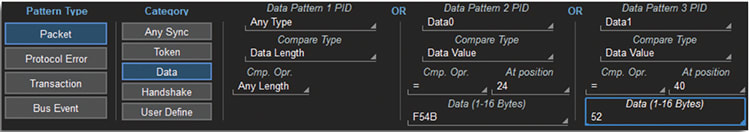 In any DATA PACKET define up to three data conditions with OR logic. Data conditions may be Data Payload Pattern or Data Length for Any, DATA0, DATA1, DATA2, or MDATA types. Data Payload Pattern Setup (Hexadecimal): # Data Bytes = 1 to 16. Data can be defined by nibble. Data Payload Pattern Setup (Binary): Any combination of 0,1, or X for 1-128 bits. Data Payload Pattern start at any location in an up to 128 Byte / 1024 bit sequence. Data Length Setup: Hexadecimal; # Data Bytes = 0 to 1024. |
