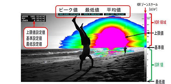 This is a software option to support 4K HDR video signals. On the picture display, the SDR area, which is the brightness range for conventional images, is displayed in monochrome. Coloring is applied to the HDR area, which exceeds the SDR area, according to the brightness. This makes it easy to check the brightness distribution in the HDR area. In addition, the waveform display supports various HDR standard scales, which can be used to manage levels based on scene linear brightness.