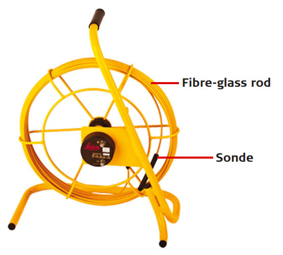 The Digitrace enables a complete length of non-metallic drains, duct or pipes to be traced when used in conjunction with the Digicat and the Digitex (or other signal transmitters). The Digitrace coiled fibre-glass rod, which protects the central copper tracing conductor, is available in lengths of 100, 165 and 260 feet. The fiberglass rod is inserted and pushed along in the utility under investigation. The Digitex is connected and the tracing signal is located on the surface by the Digicat.