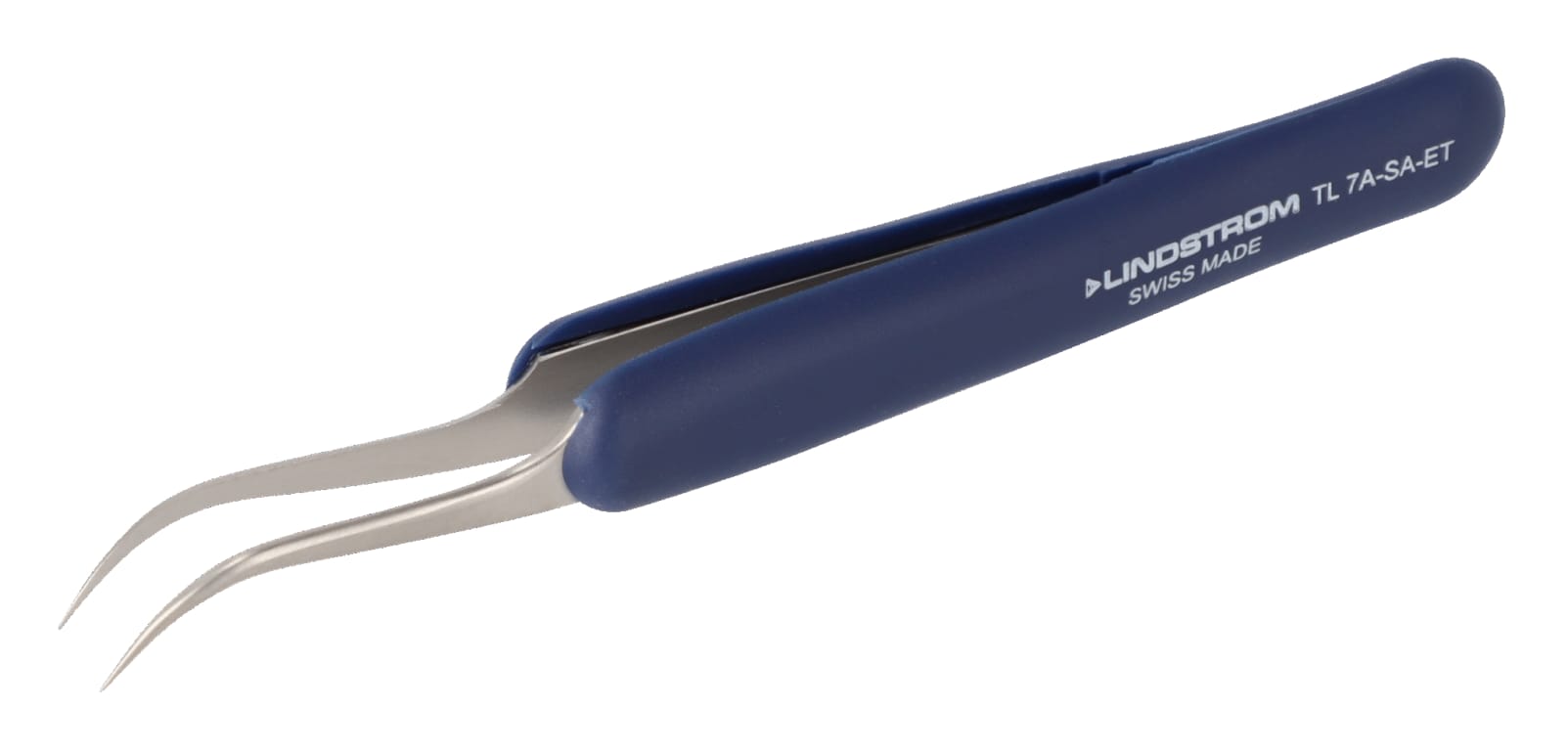 The Lindstrom 7A-SA-ET are stainless steel, ESD-safe ergonomic tweezers, style 7A, with curved and fine tips, 4.53". It's high-quality Lindström tweezers with soft, ESD-safe foam ergonomic touch grips. Static dissipative material provides reliable ESD protection. It's anti-acid, anti-magnetic stainless steel for use in many environments. ESD-safe packaging protects tweezers on the workbench and in tool cases. ET tweezers are offered on select SA, S, and NC types; contact Lindström for a quote on outfitting other tweezers with ET grips.