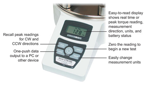 Series CTA Cap Torque Testers present a simple, accurate, and economical solution for manual cap torque testing. These cap torque testers are ideal for lab or production use for closure manufacturers, bottlers, food and beverage companies, and others. The cap torque tester captures peak readings for application and removal torques. Data output via RS-232 and Mitutoyo enable reporting and analysis of test data via PC or other data collector. Standard adjustable posts effectively grip a broad range of container shapes and sizes. Optional flat jaws and adjustable jaws are available for unique samples. Innovative mechanical overload protection provides peace of mind. The CTA cap torque tester features an aluminum housing, rugged construction and close attention to engineering you'd expect from Mark-10.