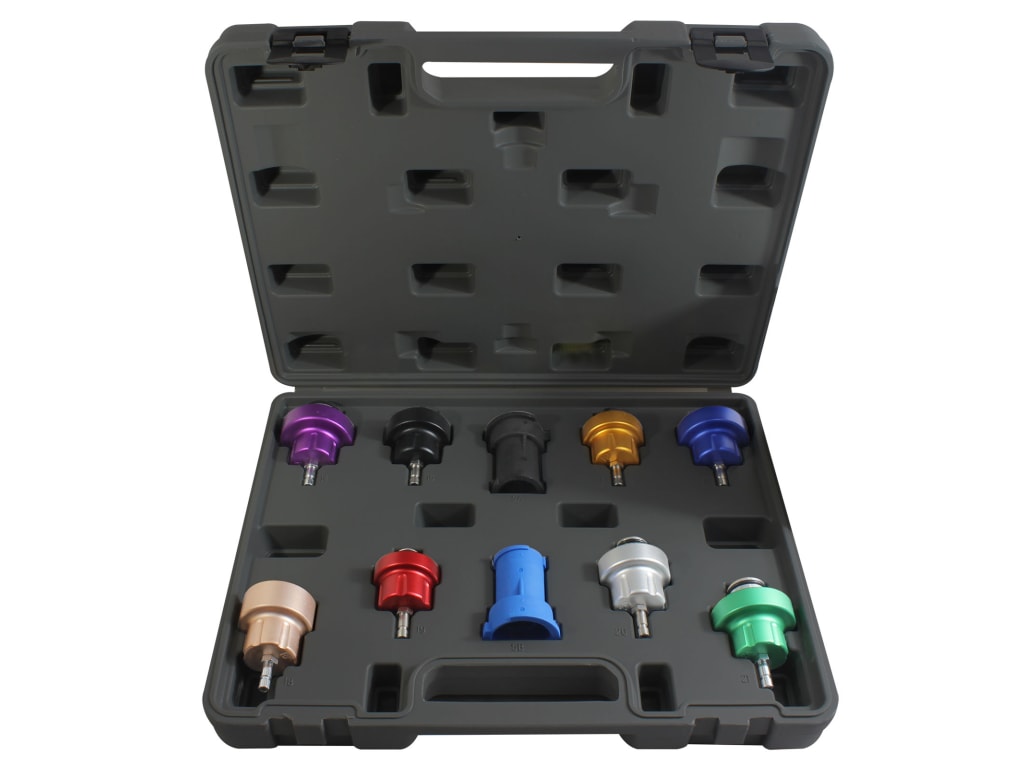 The Mastercool 43305 is a 10 Piece Cooling System Pressure Test Adapter Kit. This Product can Detects and exposes external system leaks, Detects internal engine leaks due to blown gaskets or cracked block, Adapter update kit to be used with 43300.