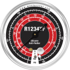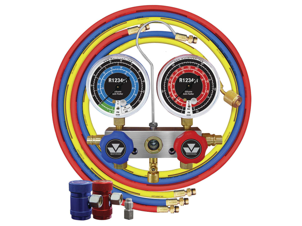 R1234yf 2-Way Piston Valve Manifold Gauge Set includes 3-72" hoses and R1234yf couplers packaged in a clamshell.
