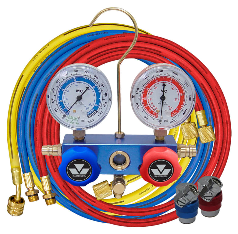 134a 2-way aluminum manifold, 3 1/8" gauges, 3 - 60" hoses: blue and red hose (14mm-M connection), yellow hose (1/2" ACME-F with auto-shut-off valve), e-z snap couplers and packaged in a clamshell.