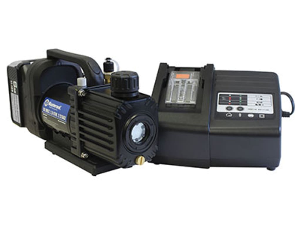 The Mastercool 90058 is a two stage, 1.5 CFM vacuum pump that is battery operated. Unlike most vacuum pumps, the 90058 runs on an 18v/6Ah rechargeable battery and does not run on a line cord. This lightweight pump weighs only 7.9 pounds and has an ultimate vacuum of 15 microns.