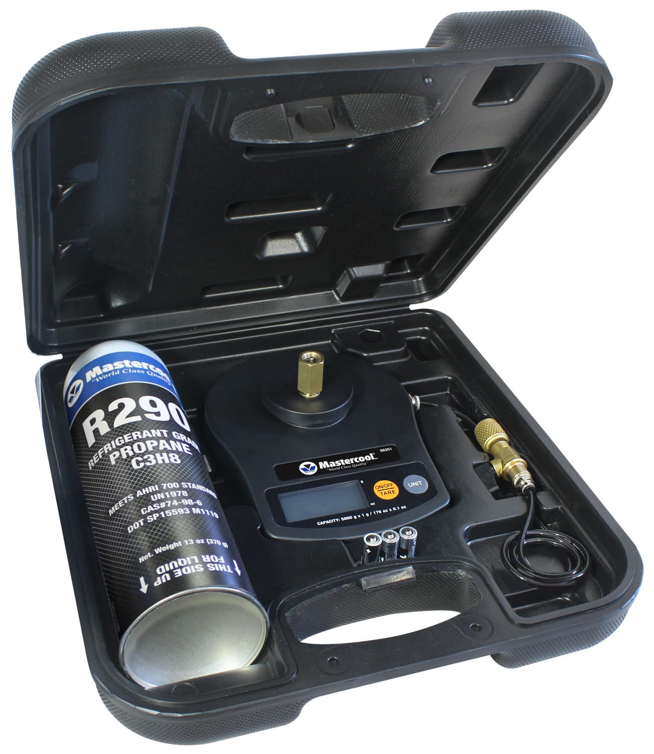 Mastercool's high precision charging scale packaged in a custom molded plastic case with a can of R290 refrigerant (13 oz (370 g)). Accurately measures small cans of refrigerant for charging systems that need a precise charge.