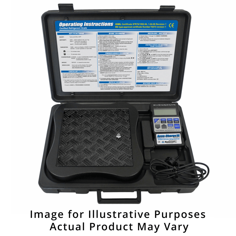The Accu-charge III certified refrigerant electronic scale allows users to program desired quantities. Before the charge is complete, an alarm will sound allowing the user ample time to turn off the refrigerant supply.