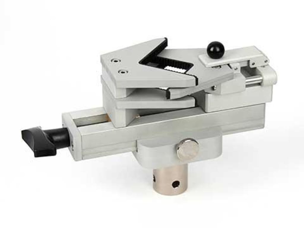 432-677 has three jaws, two vertically spaced on one side, clamping with a single jaw at mid-height. The double jaw is precisely adjusted with a screw-action handle and the single jaw is locked and unlocked into place with a toggle-action lever. This allows quick loading and release of the test sample.