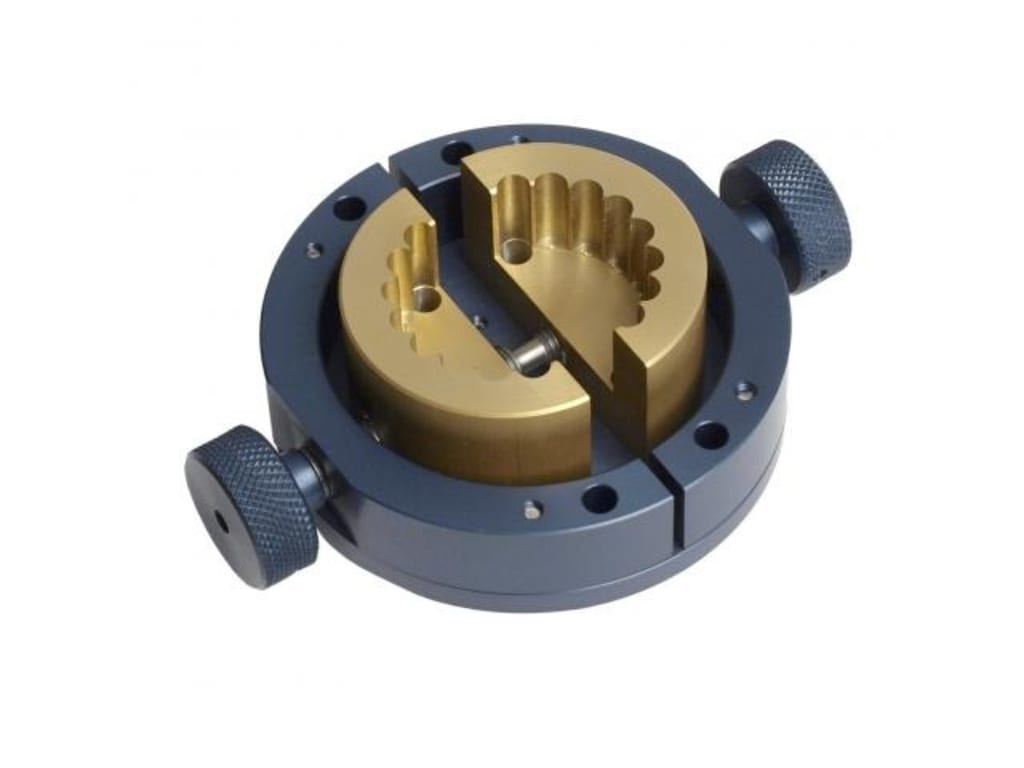 A Split Mandrel Grip comprising an outer body with lead screw and handles. Used for adjustable positioning of half-round jaws having wire-eroded serrated faces.