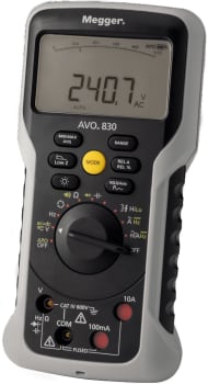 Megger AVO8 digital multimeters are the next generation of AVO meters designed for professional electricians, technicians, service personnel and engineers that require high reliability, build quality and performance in a compact, tough, weatherproof case. The AVO830 and AVO835 are True RMS multimeters with up to 1000 V AC, DC and AC+DC voltage measurement range* and current measurement from 0.1 mA to 10 A.