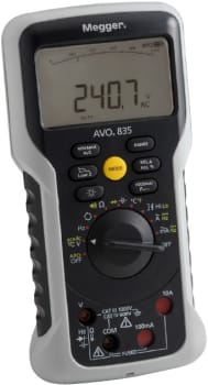 Megger AVO8 digital multimeters are the next generation of AVO meters designed for professional electricians, technicians, service personnel and engineers that require high reliability, build quality and performance in a compact, tough, weatherproof case. The AVO830 and AVO835 are True RMS multimeters with up to 1000 V AC, DC and AC+DC voltage measurement range* and current measurement from 0.1 mA to 10 A.