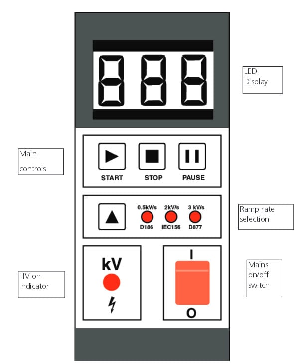" will then turn on the high voltage. The red H.V. indicator will light to show the output voltage is on. The voltage will then increase at the selected ramp rate and the corresponding value will be shown on the display. If oil breakdown occurs the instrument will detect this and immediately shut off the high voltage. The breakdown voltage value will be left on the display until the next test is started. If no breakdown occurs, the high voltage will rise to 60 kV. At this point the test voltage is cut off and this maximum value left on the display.